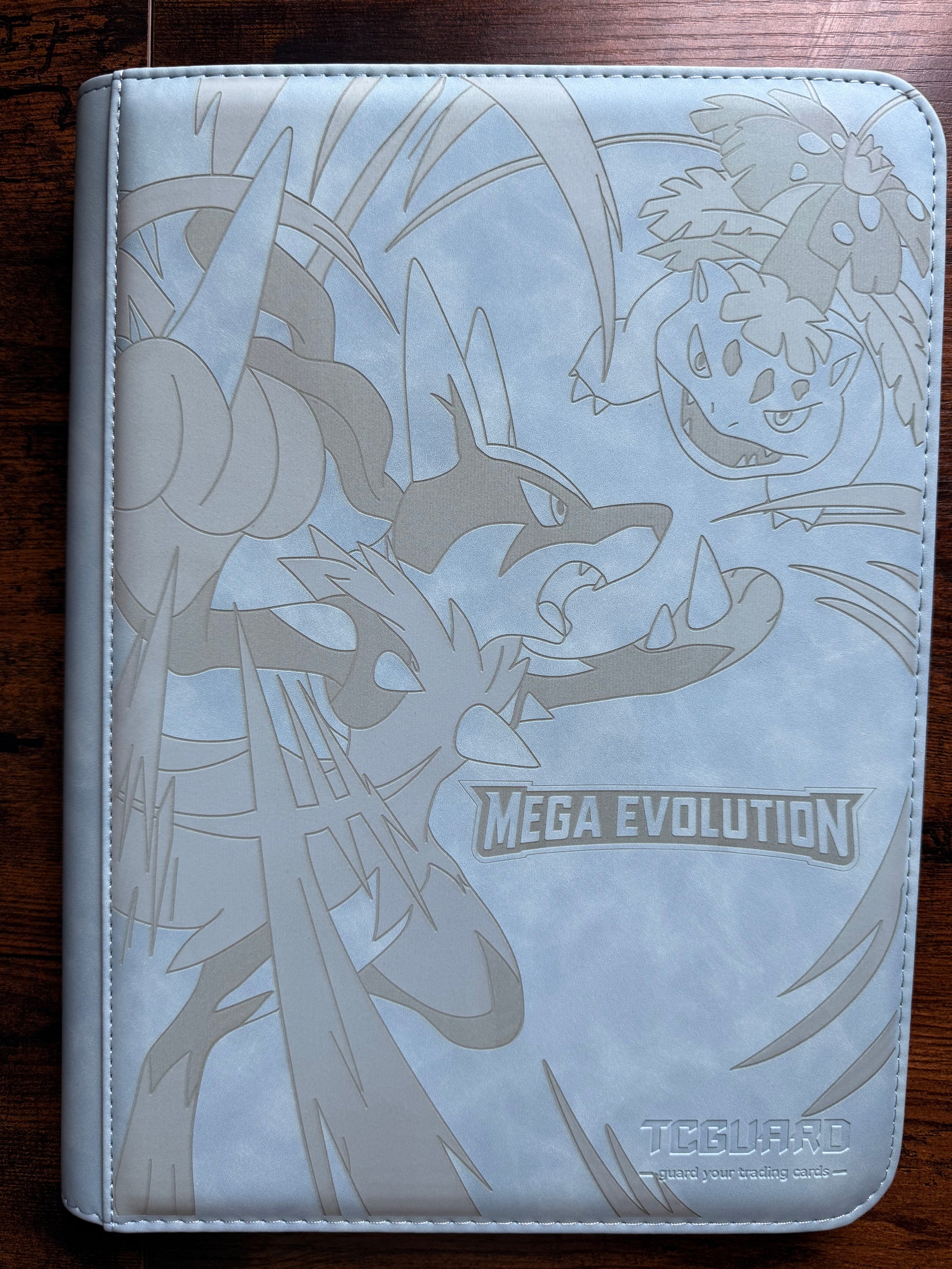 A 9 pocket 540 card tcguard binder that’s been laser engraved to feature the mega lucario ex sir artwork. As well as the set identifier on the spine.